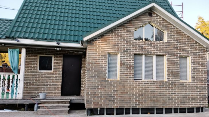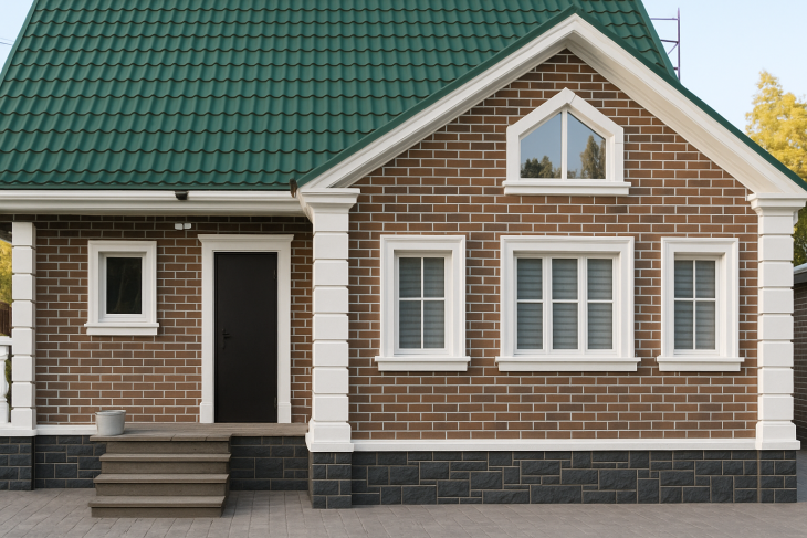 Общий вид: дом выглядит простым и незавершённым. Кирпичная кладка однотонная, фасад кажется «плоским».